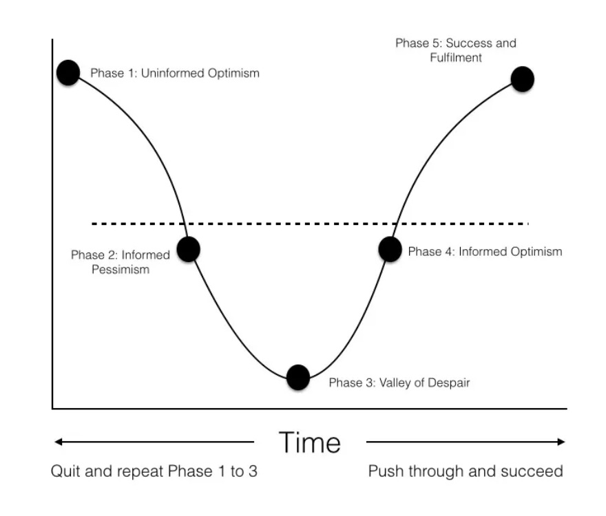 Stage 2: Informed Pessimism — Reality hits. You realize it’s harder than the Instagram reel made it look.